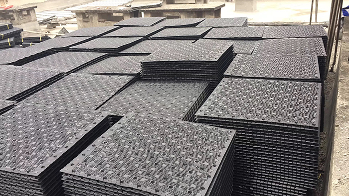 依据塔内平面布局,需有计划地裁切填料小片,以填补不规则空隙。组装块间应紧密填实,同时确保冷却塔填料与塔壁、竖井及柱梁间无缝隙,若存在缝隙,其最大宽度不得超过20毫米。安装过程中需注意组装块的方向性,每层顶面应铺设平整,并彻底清理层间杂物,以防堵塞。在填料上进行安装、检修或其他作业时,必须铺设平板,严禁直接踩踏填料。