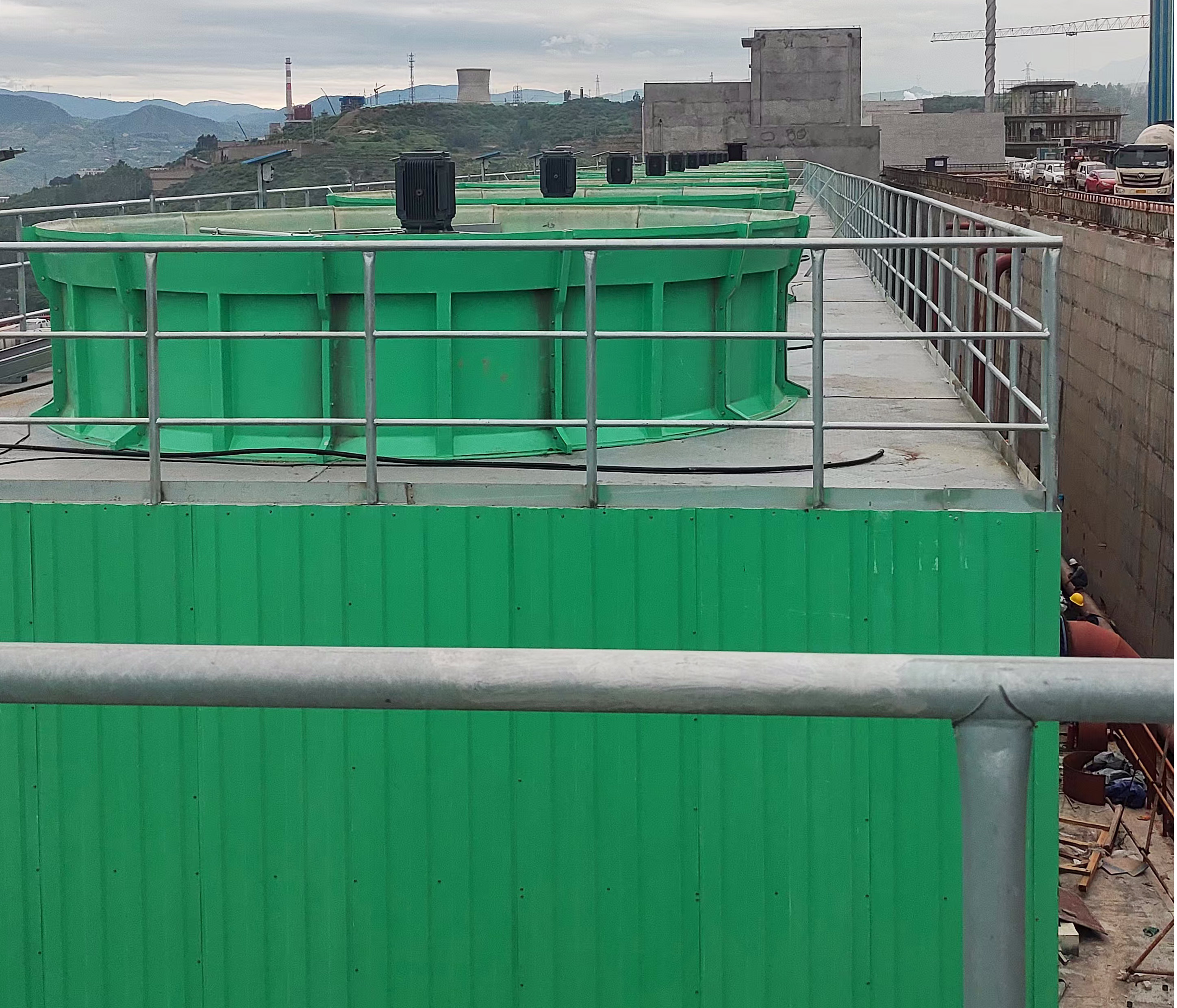 2、降低淋水噪声:淋水噪声是由于冷却水落在塔架底盘上和塔盘进水的冲击而产生的。淋水噪声会使工业机力冷却塔总噪声级增加2~5dB(a)。工业机力冷却塔的噪声级越大,喷水对总噪声级的影响越小。水池表面采用特殊的降低水面噪声的措施,如降低水池表面的泡沫层、降低水池表面噪声等。